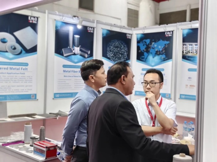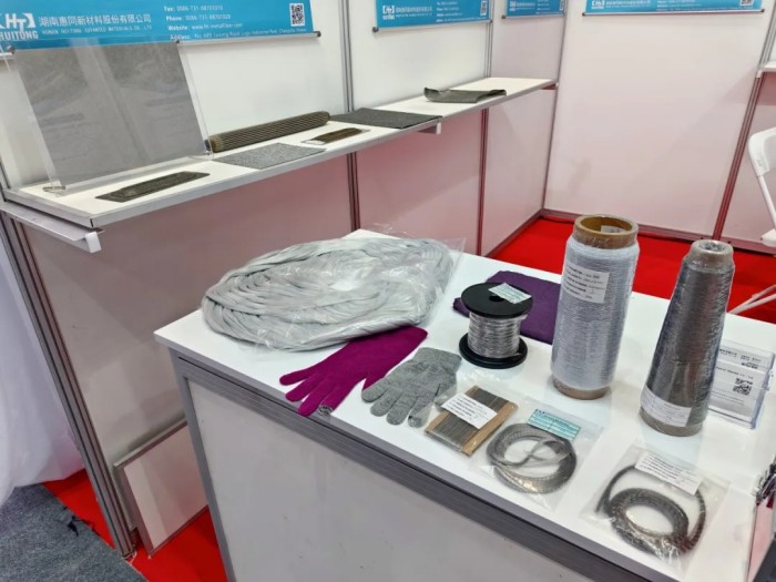 惠同新材攜各種材質(zhì)金屬纖維及其制品,包括不銹鋼纖維、銅纖維、鎳?yán)w維等,及純金屬纖維織物、金屬纖維混紡紗線、金屬纖維過濾氈等金屬纖維制品,首次展示于雅加達(dá)國際展覽中心,深深地吸引了當(dāng)?shù)乜蜕痰淖⒁狻?br />